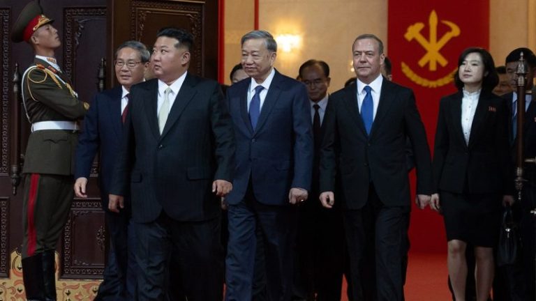 The foreign dignitaries at the parade included Chinese Premier Li Qiang, former Russian President Dmitry Medvedev, and Vietnam’s Communist Party chief To Lam.